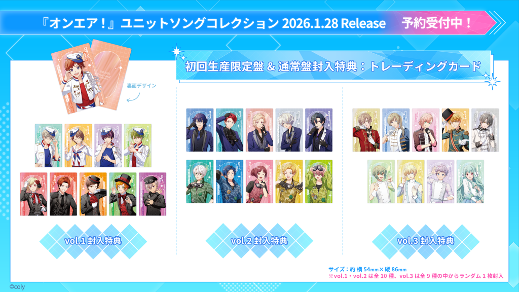 封入特典 :トレーディングカード「ユニットソングvol.2」1枚(全10種)『オンエア!』ユニットソングコレクション vol.3 -Prid’s&drop-